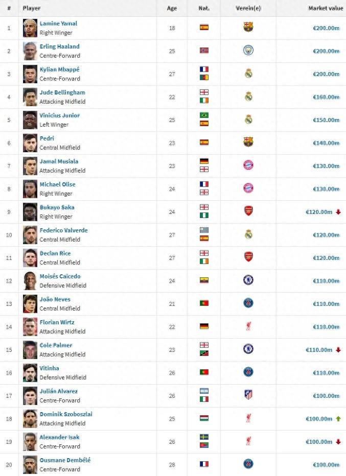 - 英超(8人):2亿的哈兰德,1.2亿的萨卡、赖斯、1.1亿的维尔茨、帕尔默、凯塞多,1亿的伊萨克、索博斯洛伊。