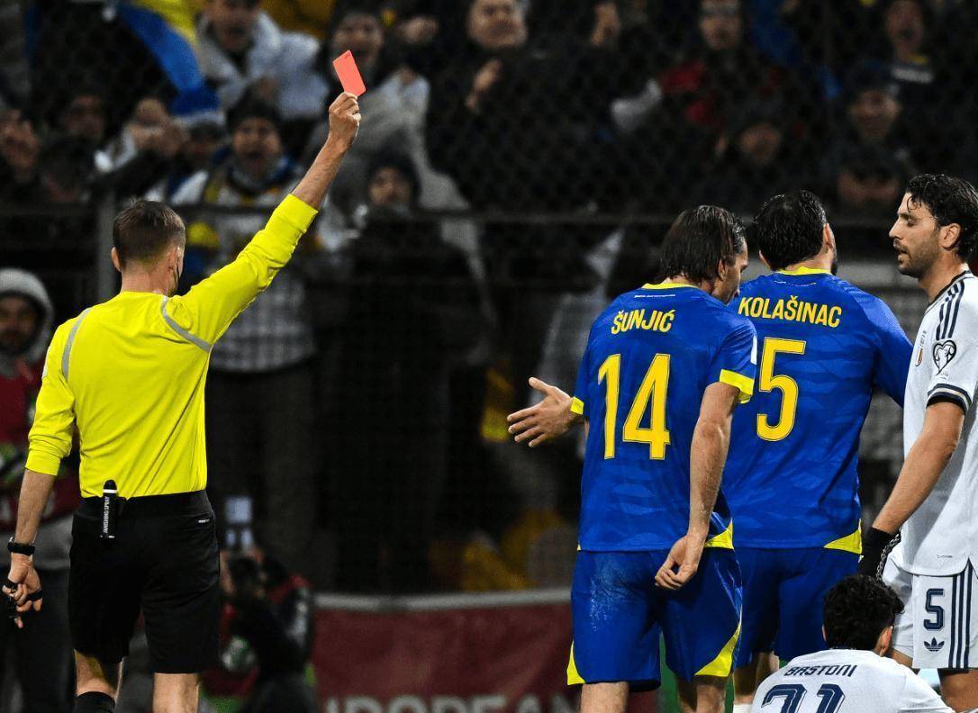 สำหรับฟุตบอลอิตาลี มันเป็นคืนที่น่าเศร้าที่ถูกลิขิตให้ถูกจารึกไว้ในประวัติศาสตร์ เกมเริ่มต้นที่สนามกีฬา Blinoboyer ในบอสเนียและเฮอร์เซโกวีนา และทีมอิตาลีก็เริ่มต้นอย่างราบรื่น ในนาทีที่ 15 ผู้รักษาประตูของบอสเนีย Vasi ทำผิดพลาดร้ายแรง บอลของเขาถูกตัดขาดโดยบาร์เรร่ากองกลางชาวอิตาลีซึ่งช่วยมอยส์ คีน ให้ยิงประตูทันที และอิตาลีก็ขึ้นนำ 1-0 อย่างไรก็ตาม จุดเปลี่ยนของโชคชะตามาอย่างรวดเร็ว ในนาทีที่ 41 ผู้รักษาประตูชาวอิตาลี Donnarumma เปิดเท้าใหญ่ของเขา และลูกบอลถูกผลักกลับโดย Bossian และผู้เล่นที่เป็นมรดกเพื่อสร้างการยิงด้วยมือเดียว แบสโทนี่ กองหลังตัวกลาง ในฐานะกองหลังคนสุดท้าย ไม่มีทางเลือกอื่นนอกจากต้องพลั่ว และผู้ตัดสิน Tilpan ได้แสดงใบแดงโดยตรงและส่งเขาออกไป ใบแดงนี้เปลี่ยนแนวโน้มของเกมโดยสิ้นเชิง