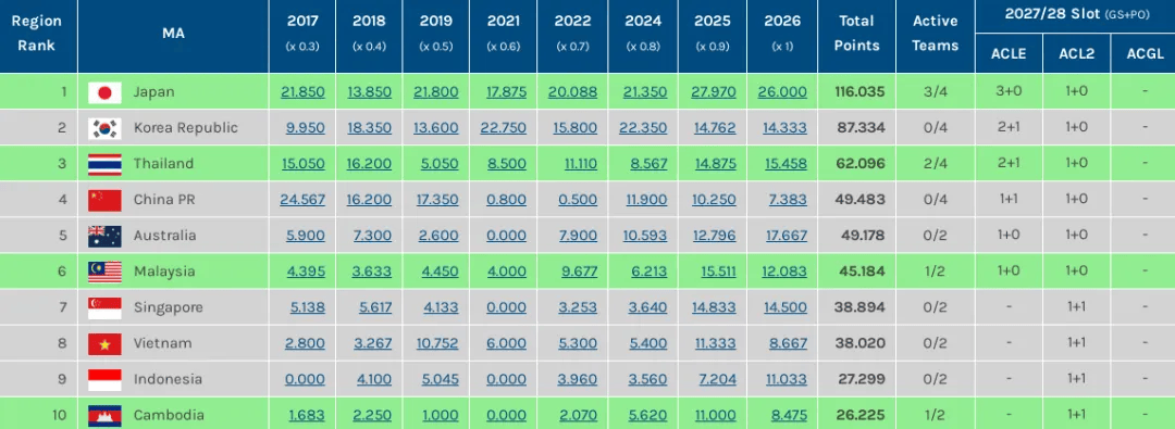 ที่ผ่านมา “ลีกสาม” ในภูมิภาคเอเชียตะวันออกที่ได้ปล้ำกับญี่ปุ่นและเกาหลีใต้ดิ่งลงกับผลงาน “เอเชีย สงคราม” และสถานะของลีกก็ตกครั้งแล้วครั้งเล่า ในปี 2028 ลีกเอิงอาจสูญเสียสถานะของ "ห้าเมเจอร์ลีก" และน้อยกว่าหนึ่งคะแนนแชมเปี้ยนส์ลีก แต่จีนซูเปอร์ลีกอาจพลาด AFC Champions League Elite League อย่างสมบูรณ์และหลุดจากหกอันดับแรกในการจัดอันดับเอเชียตะวันออก