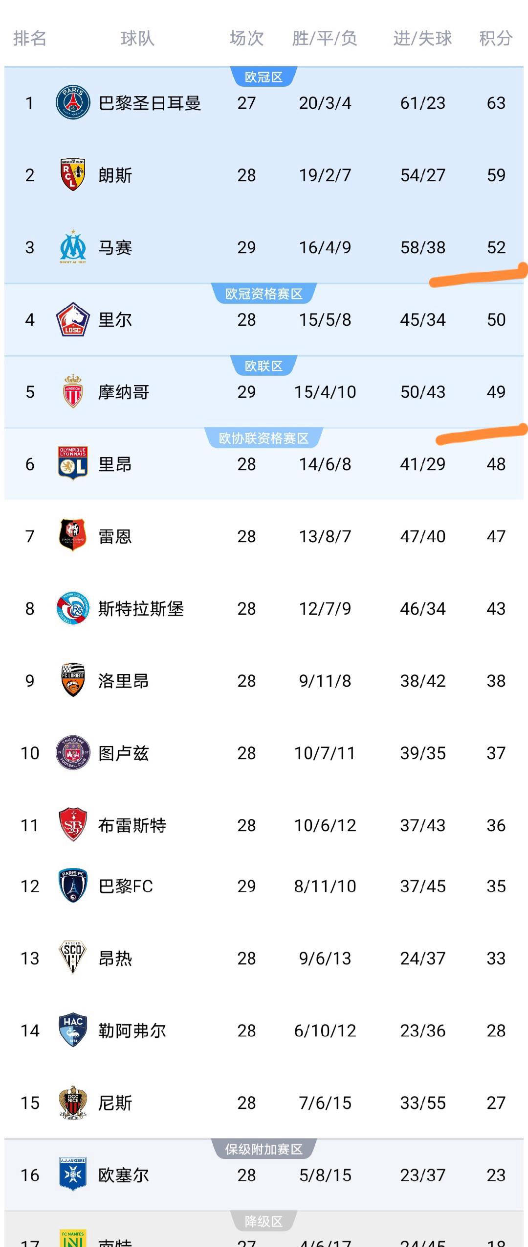 ตามอันดับล่าสุด ปารีส แซงต์-แชร์กแมง ครองอันดับ 63 ตามด้วยเลนส์ 59 แต้ม และมาร์กเซยอยู่ในอันดับที่สามด้วยคะแนน 53 แต้ม ลีลล์อยู่ในอันดับที่สี่ด้วยคะแนน 50 คะแนน โมนาโกอยู่ในอันดับที่ห้าด้วย 49 คะแนน และลียงอยู่ในอันดับที่หกด้วย 48 คะแนน การเพิ่มขึ้นของ FC ในปารีสและชะตากรรมของ Metz ทำให้การแข่งขันแบบ Intensive Intensilict ของทีมต้นน้ำในลีกเอิง 1 ไม่เป็นที่นิยม และการแข่งขันเพื่อตกชั้นและคุณสมบัติสงครามยุโรปได้เข้มข้นขึ้นเรื่อยๆ ในแง่ของรายชื่อผู้ทำประตู ผู้เล่นสองคนยิงได้ 16 ประตู และผู้เล่นคนหนึ่งมี 15 ประตู และการต่อสู้ของรองเท้าทองคำก็ดุเดือดมากเช่นกัน!
