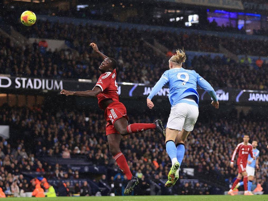 เมื่อการแข่งขันเริ่มต้นขึ้น ด็อกคูที่ร้อนแรงก็สร้างแรงกดดันอย่างหนักต่อแนวรับของลิเวอร์พูลทันที ในนาทีที่ 12 เขาถูกทำฟาวล์ในเขตโทษ ทำให้แมนเชสเตอร์ ซิตี้ได้จุดโทษน่าเสียดายที่จุดโทษของฮาแลนด์ถูกมามาร์ดชวิลีเซฟได้อย่างยอดเยี่ยม – เป็นครั้งที่สามที่มามาร์ดชวิลีเซฟจุดโทษของฮาแลนด์ในพรีเมียร์ลีก อย่างไรก็ตาม เขาได้แก้ตัวในอีก 13 นาทีต่อมาเมื่อนูเนสเปิดบอลจากทางขวาและฮาแลนด์โหม่งบอลเข้ามุมไกล พาแมนซิตี้ขึ้นนำ 1-0