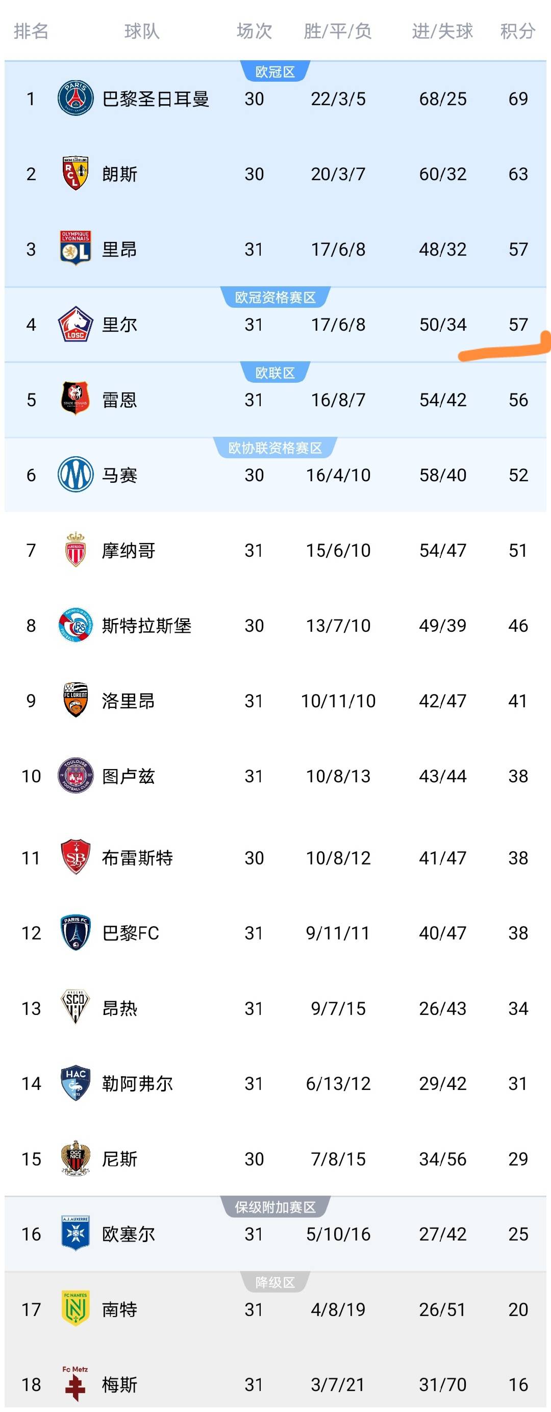 จะเห็นได้ว่าคะแนนของลีลล์เพิ่มขึ้นเป็น 57 แต้ม เข้าใกล้อันดับสาม และการแข่งขันสำหรับลีกเอิง 1 ที่สามนั้นรุนแรงขึ้น