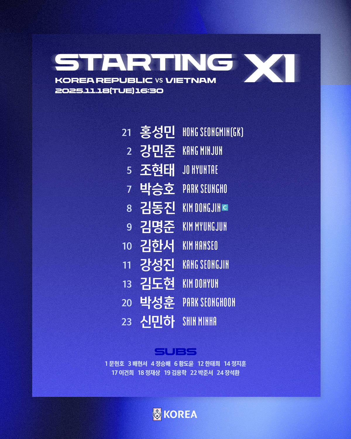 FW: 7-ซน ฮึง-มิน (11-ฮวาง ฮี-ชาน 62'), 18-โอ ฮยอน-กยู (9-โช กู-ซอง 62'), 19-อี คัง-อิน (17-ยิม จี-ซอง 87')