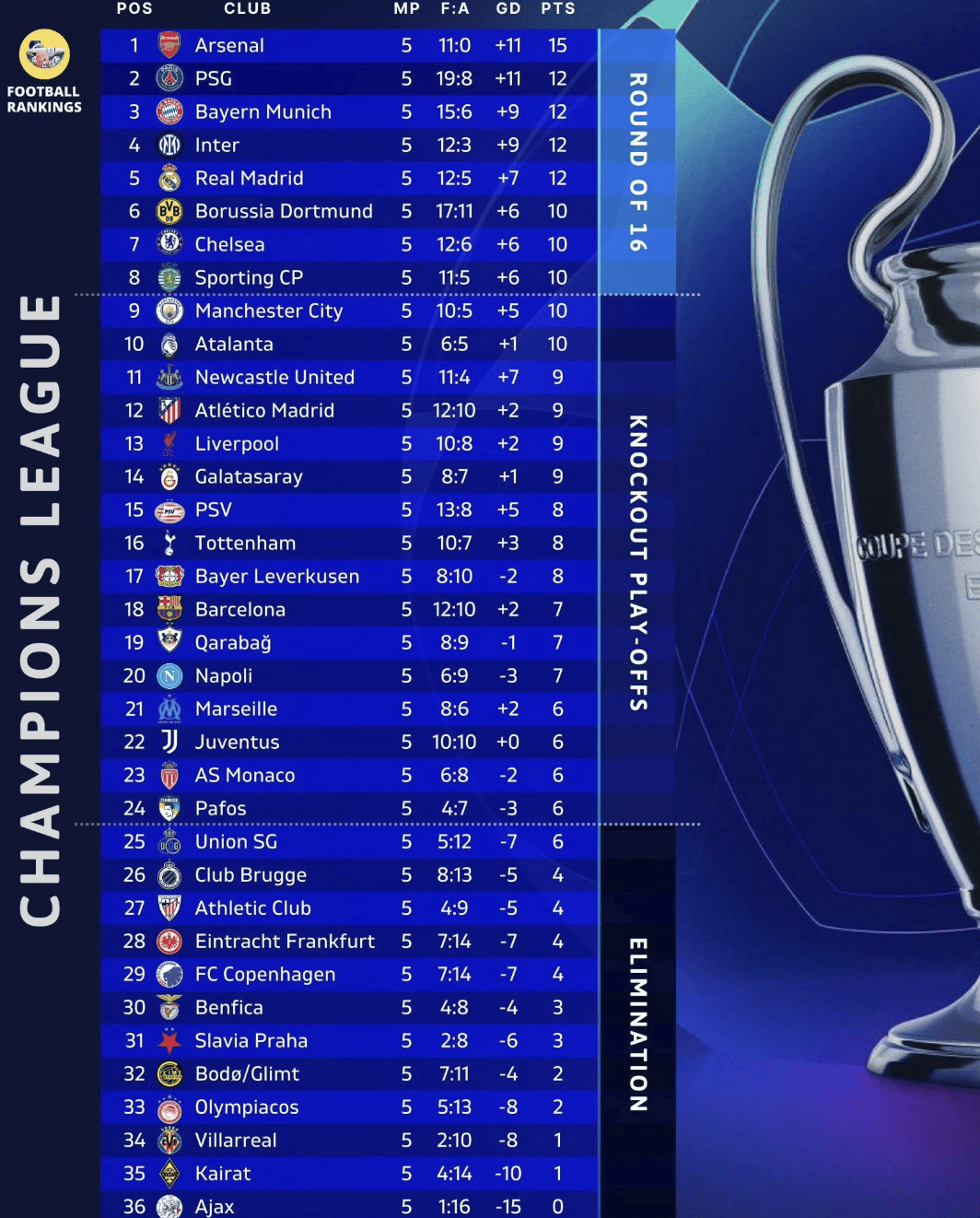 ในการแข่งขันเยือนของเรอัล มาดริดกับโอลิมเปียกอส ทีมราชันชุดขาวคว้าชัยชนะอย่างหวุดหวิด 4-3 วินิซิอุส จูเนียร์ ทำสองแอสซิสต์ ขณะที่ คีเลียน เอ็มบัปเป้ ทำแฮตทริกแรกให้กับทั้งเรอัล มาดริดและในแชมเปียนส์ลีก ปัจจุบันตารางคะแนนแชมเปียนส์ลีกมีสี่ทีมที่มีสถิติชนะสี่แพ้หนึ่งเท่ากัน ได้แก่ ปารีส แซงต์-แชร์กแมง, บาเยิร์น มิวนิค, อินเตอร์ มิลาน และเรอัล มาดริด ซึ่งทั้งหมดมี 12 คะแนน อยู่ในอันดับที่สองถึงห้าตามลำดับ ตามหลังอาร์เซนอลที่นำจ่าฝูงด้วย 15 คะแนน