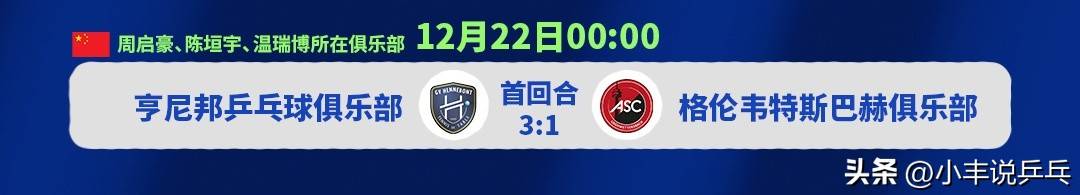 เวลา 00:00 น. ตามเวลาปักกิ่ง วันที่ 22 ธันวาคม การแข่งขันรอบ 16 ทีมสุดท้ายของลีกแชมเปียนส์เทเบิลเทนนิส รอบที่สอง จะเป็นการพบกันระหว่างทีมเฮนเนบอนต์จากฝรั่งเศสกับทีมกรูเนวัลด์บาคจากเยอรมนี โดยเฮนเนบอนต์ได้เปรียบจากการชนะ 3-1 ในเกมแรกที่เล่นนอกบ้าน ทำให้พวกเขาเพียงแค่ต้องรักษาสกอร์ไว้เพื่อผ่านเข้ารอบต่อไป หากพวกเขาผ่านเข้ารอบไปได้ พวกเขาอาจต้องพบกับทีมซาร์บรึคเคินของแฟนเจินตงในรอบต่อไป ซึ่งจะเป็นการดวลกันระหว่างทีมชาวจีนโพ้นทะเลวงการปิงปองยุโรปในขณะนี้ไม่ได้มุ่งเน้นเพียงแค่ผู้เล่นที่มีชื่อเสียงอย่าง ฟาน เจินตง เท่านั้น ทีมเฮนเนบองได้รวบรวมดาวรุ่งสามคนจากทีมชาติจีน ได้แก่ โจว ฉีฮาโอ, เฉิน หยวนหยวน, และ เหวิน รูอิโบ ร่วมกับ ไซมอน เกิทซ์ สร้างผลงานที่น่าประทับใจทั้งในลีกฝรั่งเศสและแชมเปียนส์ลีก