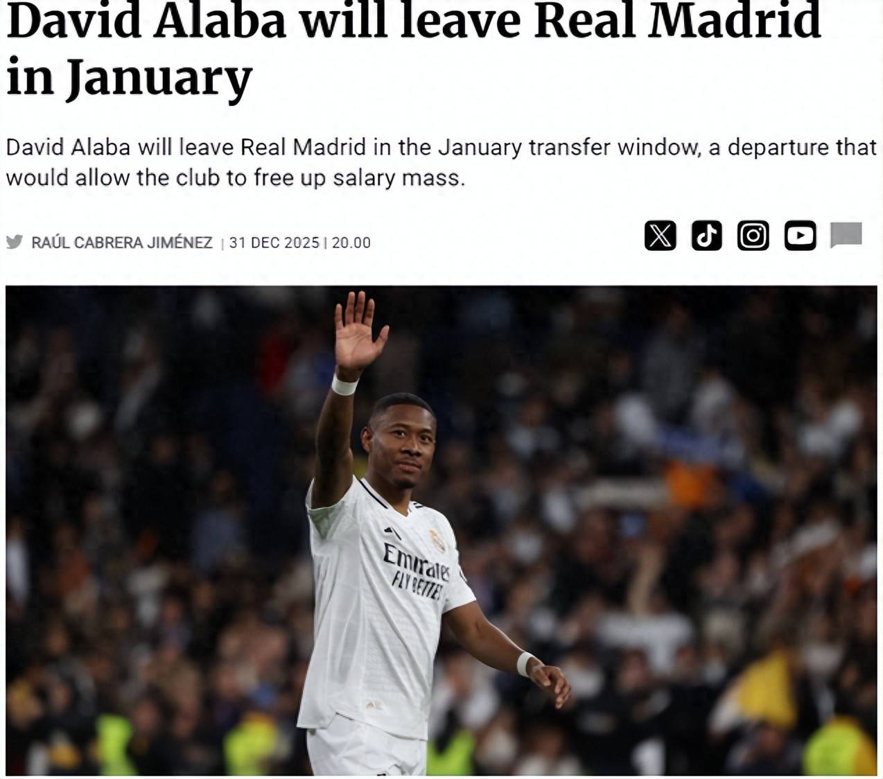 ตลาดซื้อขายนักเตะช่วงฤดูหนาวของลาลีกาได้เปิดขึ้นแล้ว โดยเรอัล มาดริดกำลังพิจารณาข้อเสนอจากชาร์ล็อตต์ เอฟซี ทีมในเมเจอร์ลีกซอคเกอร์ ที่ต้องการคว้าตัวดาวิด อลาบา กองหลังค่าเหนื่อยสูงของสโมสร ตามรายงานจากสื่อสเปน ชาร์ล็อตต์ เอฟซี กำลังพยายามเซ็นสัญญากับนักเตะทีมชาติออสเตรียวัย 29 ปี ด้วยค่าตัว 1.5 ล้านยูโร