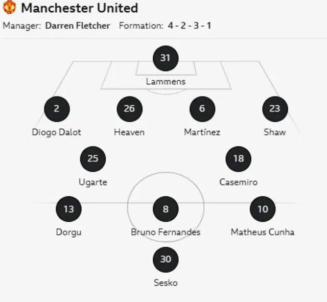 เฟลตเชอร์ตอบสนองต่อความต้องการของแฟนบอลด้วยการจัดทีมในรูปแบบ 4-2-3-1กัปตันบรูโน่ เฟอร์นันเดส กลับมาจากการบาดเจ็บเพื่อเริ่มต้นและกลับมารับบทบาทหมายเลข 10 อีกครั้ง โดยร่วมสร้างแนวรุกกับเชสโก, ปาทริซิโอ โดจ และคุนญ่า คาเซมิโรและอูการ์เต้ครองตำแหน่งกองกลางตัวรับ ขณะที่แนวรับยังคงไม่เปลี่ยนแปลง โดยมีดิโอโก้ ดาโลต์, เอเดน เฮเวน, ลิซานโดร มาร์ติเนซ และลุค ชอว์ โดยมีเซนา ราเมนส์อยู่ระหว่างเสาประตูตามปกติ