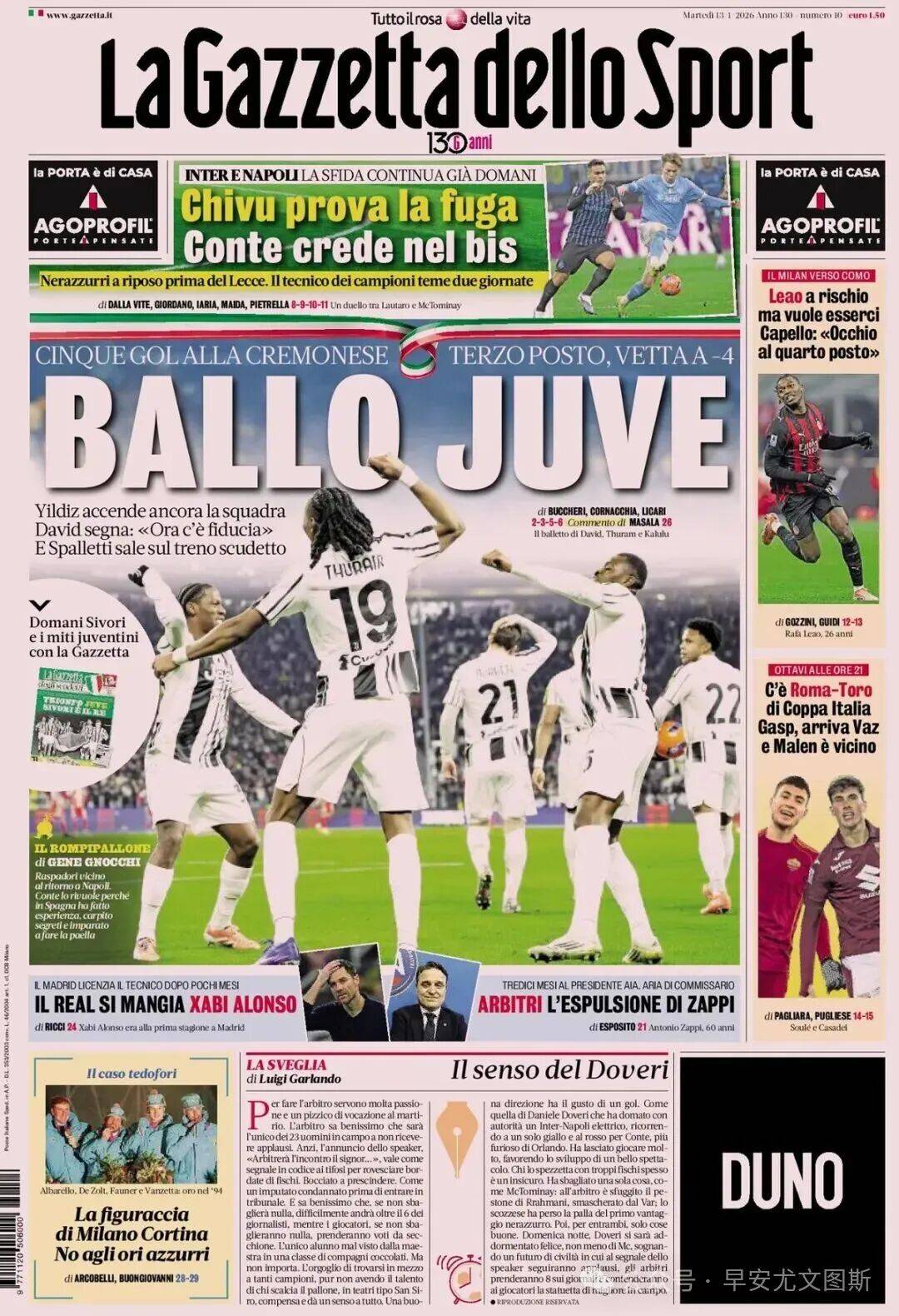 1. ยูเวนตุส คุณจะไม่มั่นใจได้อย่างไร? ชัยชนะ 5-0 เหนือเครโมเนเซ่ – สิ่งที่ไม่เคยเห็นในประเทศมานานถึงสิบปี.อยู่ในอันดับสามร่วมกับโรม่าและนาโปลี, ตามหลังจ่าฝูงเพียงสี่คะแนน, แฟนบอลกำลังฝันถึงแชมป์ลีก. ชนะห้าจากหกนัดล่าสุด:สไตล์และความมั่นใจ.ดูเหมือนว่าสถานการณ์จะเปลี่ยนไปแล้ว: ประตูโชคดีของเบรเมอร์, ดีบาล่ายิงอีกครั้ง, และจุดโทษที่เป่าให้จัลโลรอสซี่ถูกยกเลิก (นิโคล่าถูกไล่ออก)อิลดิซยิงจุดโทษซ้ำเข้าไป, เทอร์ราคเชียโนทำเข้าประตูตัวเอง, และแม็คเคนนีปิดท้ายชัยชนะ สปัลเล็ตติกล่าวว่า: "ผมได้ดูการปะทะระดับสูงระหว่างอินเตอร์ มิลานกับนาโปลี เรายังต้องพัฒนาอีกมาก แต่ถ้าเราเดินตามขั้นตอนนี้ เราสามารถประสบความสำเร็จได้"การเสริมทัพในแนวรับกำลังปรากฏขึ้น โดยมีมิงเกซเป็นผู้นำ