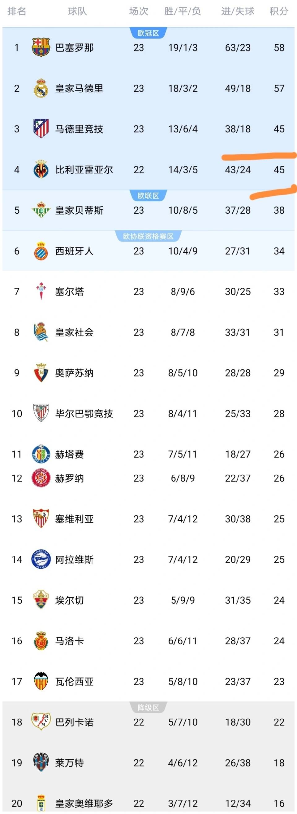 ทุกท่าน, ลาลีกา รอบที่ 23 ได้จบลงแล้ว!ในช่วงเช้าตรู่ของวันนี้ การแข่งขันนัดสุดท้ายของรอบที่ 23 ของลาลีกาได้สิ้นสุดลงด้วยการท้าทายนอกบ้านของเอสปันญอลกับบียาร์เรอัล การปะทะกันระหว่างทีมระดับสูงกับทีมอันดับต่ำกว่านี้ส่งผลให้เกิดสกอร์ที่ขาดลอย เมื่อการแข่งขันนี้สิ้นสุดลง ทุกทีมในลาลีกาได้เสร็จสิ้นการแข่งขันในรอบที่ 23 แล้ว ตารางลีกมีการเปลี่ยนแปลงอย่างมาก ในขณะที่อันดับของผู้ทำประตูสูงสุดก็ชัดเจนขึ้นเรื่อยๆ นักเตะดาวเด่นสี่คนได้ติดอันดับร่วมกัน โดยทุกการเปลี่ยนแปลงได้ครองใจแฟนๆ อย่างมาก