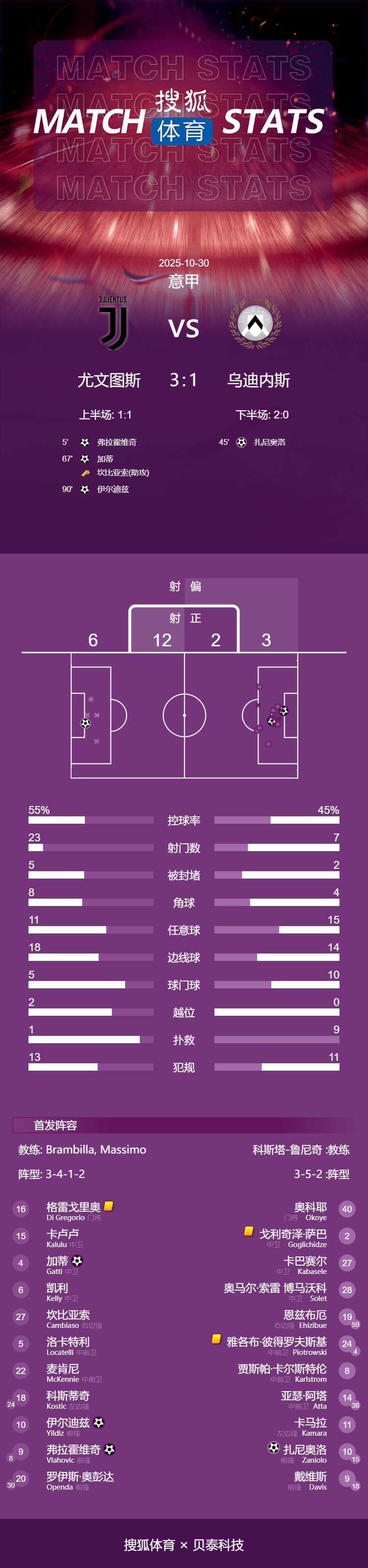 เวลา 01:30 น. ตามเวลาปักกิ่ง วันที่ 30 ตุลาคม ยูเวนตุสเปิดบ้านรับการมาเยือนของอูดิเนเซ่ ในรอบที่เก้าของเซเรียอา ครึ่งแรก ดูซาน วลาโฮวิช ยิงจุดโทษเข้าไปเปิดสกอร์ ก่อนที่ นิโคโล ซานิโอโล จะตีเสมอ หลังจากพักครึ่ง เฟเดริโก กัตติ โหม่งทำประตูให้ทีมขึ้นนำอีกครั้ง และ เมริห์ เดมิรัล ยิงจุดโทษปิดท้าย ยูเวนตุสเอาชนะอูดิเนเซ่ 3-1 หยุดสถิติไร้ชัยชนะในทุกรายการไว้ที่ 8 นัด