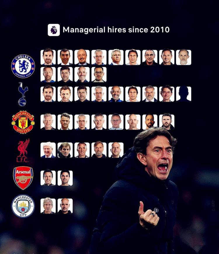 สถิติเผยให้เห็นว่าตั้งแต่ปี 2010 เป็นต้นมา มีความแตกต่างอย่างชัดเจนในอัตราการเปลี่ยนแปลงผู้จัดการทีมในหมู่สโมสร 'บิ๊กซิกส์' แบบดั้งเดิมของพรีเมียร์ลีก เชลซีเป็นผู้นำด้วยจำนวนการเปลี่ยนแปลงผู้จัดการทีมที่น่าตกใจถึง 13 ครั้ง โดยมีชื่อใหญ่ๆ เช่น อันเดร วิลลาส-โบอาส, โชเซ่ มูรินโญ่, อันโตนิโอ คอนเต้, เมาริซิโอ ซาร์รี่ และแม้กระทั่ง เมาริซิโอ โปเช็ตติโน่ ท็อตแน่ม ฮ็อทสเปอร์ตามมาติดๆ โดยมีการจ้างหัวหน้าโค้ชที่แตกต่างกันถึง 9 คนแมนเชสเตอร์ ยูไนเต็ด ได้เห็นผู้จัดการทีมถึงแปดคนเข้ามาคุมทีม ขณะที่ลิเวอร์พูลมีความเสถียรภาพมากกว่าโดยมีผู้จัดการเพียงห้าคนเท่านั้น นับตั้งแต่ปี 2010 อาร์เซนอลและแมนเชสเตอร์ ซิตี้ ซึ่งเป็นสองทีมยักษ์ใหญ่จากลอนดอนเหนือและแมนเชสเตอร์ตามลำดับ ได้แต่งตั้งผู้จัดการทีมถาวรเพียงสองคนเท่านั้น: อูไน เอเมรี และมิเกล อาร์เตตา ที่อาร์เซนอล และมานูเอล เปเยกรินี และเป๊ป กวาร์ดิโอลา ที่ซิตี้ นี่สะท้อนถึงความไว้วางใจอย่างลึกซึ้งของทั้งสองสโมสรต่อการแต่งตั้งผู้จัดการทีม และความมุ่งมั่นในการวางแผนระยะยาว