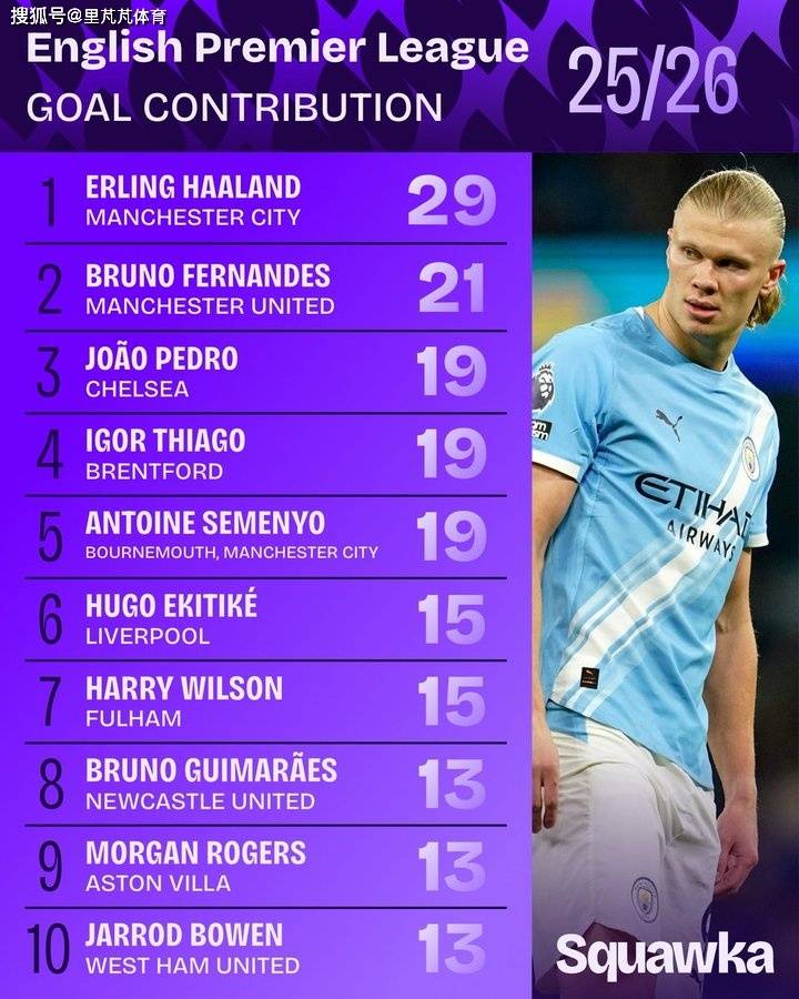 หน่วยงานข้อมูล Squawka นับเป้าหมายการมีส่วนร่วมของผู้เล่นในพรีเมียร์ลีกในฤดูกาลนี้ (ประตู + ผู้ช่วย) และรายการ ฮาร์แลนด์ กองหน้า แมนฯ ซิตี้ ติดอันดับ 29 ประตู โชว์ฟอร์มเกมรุกได้อย่างน่าสะพรึงกลัว ค่าตัว core b ของแมนเชสเตอร์ ยูไนเต็ด เป็นอันดับสอง 21 ประตู และ โจอาโอ เปโดร กองหน้าเชลซี และ อิกอร์ ติอาโก้ กองหน้าของ เบรนท์ฟอร์ด และเซเมนิโอ ปีกของแมนเชสเตอร์ ซิตี้ เสมอกันเป็นอันดับสามด้วย 19 ประตู
