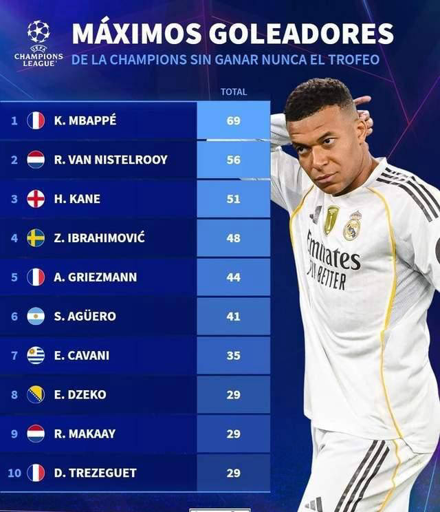ในรายการแชมเปี้ยนส์ลีก ปัจจุบัน เอ็มบัปเป้ อยู่ในอันดับที่ 1 ในบรรดาผู้เล่นที่ยังไม่คว้าแชมป์ด้วยสกอร์ 69 ประตู อันดับเบื้องหลังเขาคือ Vannis Troui 56 ประตู, Kane 51 ประตู, Ibrahimovic 48 ประตูและ Griezmann 44 ประตู รายชื่อพิสูจน์อีกครั้งว่าถึงแม้ Mbappe จะยังไม่ชนะแชมเปี้ยนส์ลีก แต่เขาก็ยังเป็นกองหน้าที่คุกคามอย่างมาก