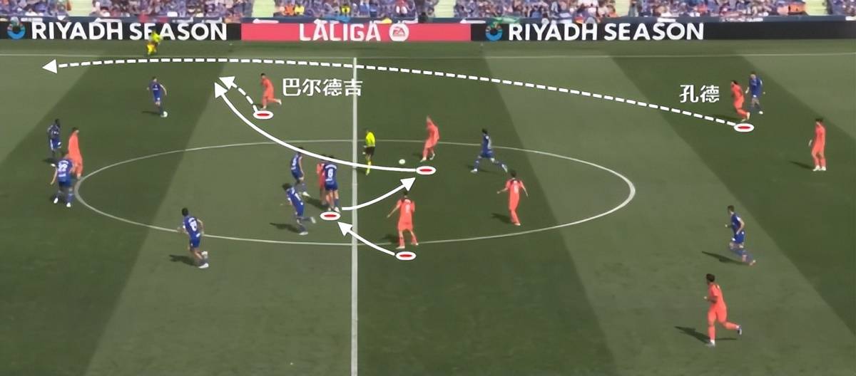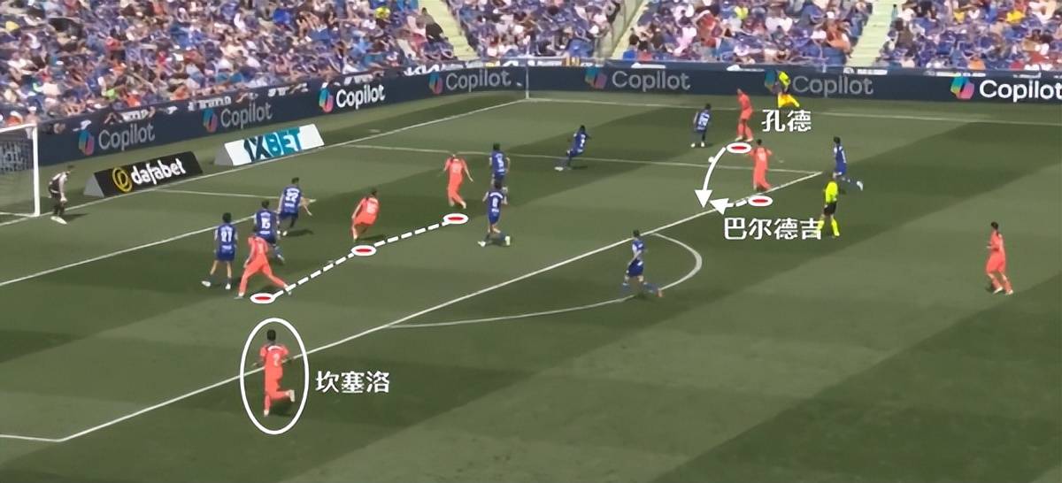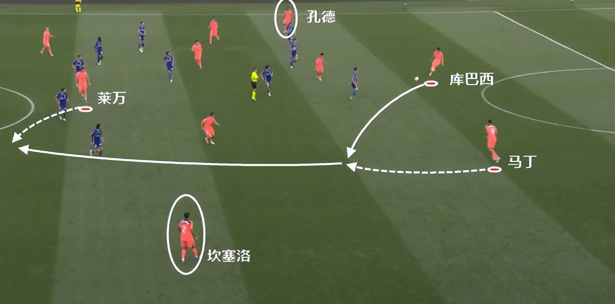 คราวนี้ความผิดเป็นเรื่องปกติมาก เมื่อแข้งของทีมบาร์เซโลน่าเข้ามาด้านใน ฟูลแบ็คจะขยายความกว้างเหมือนปีก ลักษณะของ Kong De คือหลังจากที่ฝ่ายซ้ายรับบอล เขาไม่มีลูกบอลและวางสายนอกเพื่อพบกับเขา ดังนั้นเขาจึงค่อนข้างถอยหลัง แต่ก็ไม่ได้หมายความว่า Kong De จะไม่เข้าร่วมในการโจมตี