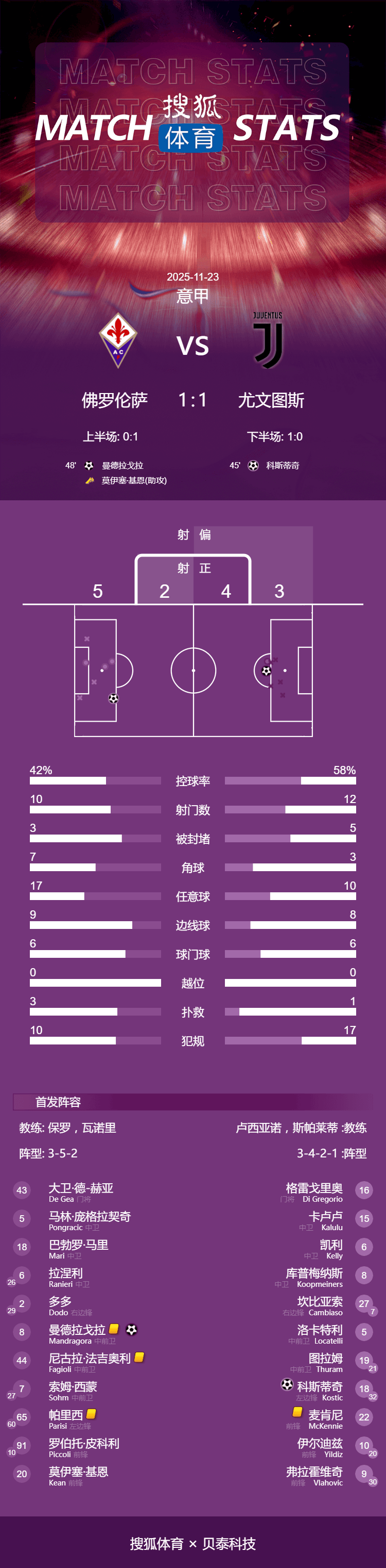 เวลา 01:00 น. ตามเวลาปักกิ่ง วันที่ 23 พฤศจิกายน 2025 ฟิออเรนตินาเปิดบ้านต้อนรับยูเวนตุสในรอบที่ 12 ของเซเรียอา ในครึ่งแรก คอสตic ทำประตูให้ยูเวนตุสขึ้นนำ มานดรากอร่าทำประตูตีเสมอให้กับฟิออเรนตินาในครึ่งหลัง การแข่งขันจบลงด้วยผลเสมอ 1-1