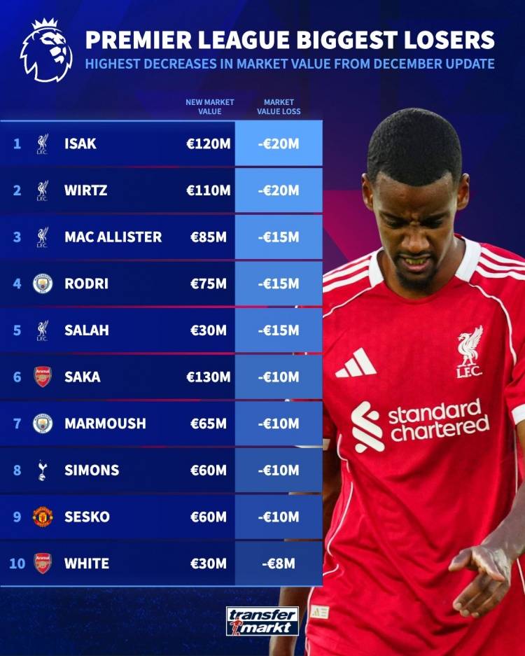 เมื่อวันที่ 10 ธันวาคม ตามเวลาปักกิ่ง สื่อเยอรมัน Transfermarkt ได้อัปเดตมูลค่าผู้เล่นพรีเมียร์ลีกครั้งล่าสุด โดย เออร์ลิง ฮาแลนด์ เพิ่มขึ้น 20 ล้านยูโร กลับมาครองตำแหน่งอันดับหนึ่งของโลกอีกครั้งที่ 200 ล้านยูโรเอสเตบัน ดาวรุ่งของเชลซีที่ได้รับการยกย่องอย่างสูงก็มีมูลค่าเพิ่มขึ้นเช่นกัน โดยเพิ่มขึ้นถึง 20 ล้านยูโร ขณะที่ลิเวอร์พูลประสบกับความล้มเหลวครั้งใหญ่ โดยทั้งไอแซคและวิร์ตซ์เป็นผู้นำในการลดลง มูลค่าลดลง 20 ล้านยูโร ขณะที่มูลค่าของซาลาห์ลดลง 15 ล้านยูโร