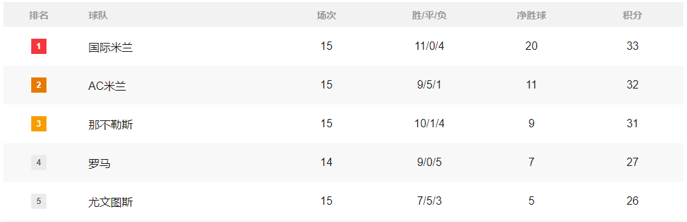 เมื่อวันที่ 15 ธันวาคม เวลาปักกิ่ง ลีกฟุตบอลชั้นนำของยุโรปทั้งห้าลีกได้จัดการแข่งขันอีกครั้ง โดยอันดับปัจจุบันเป็นดังนี้: