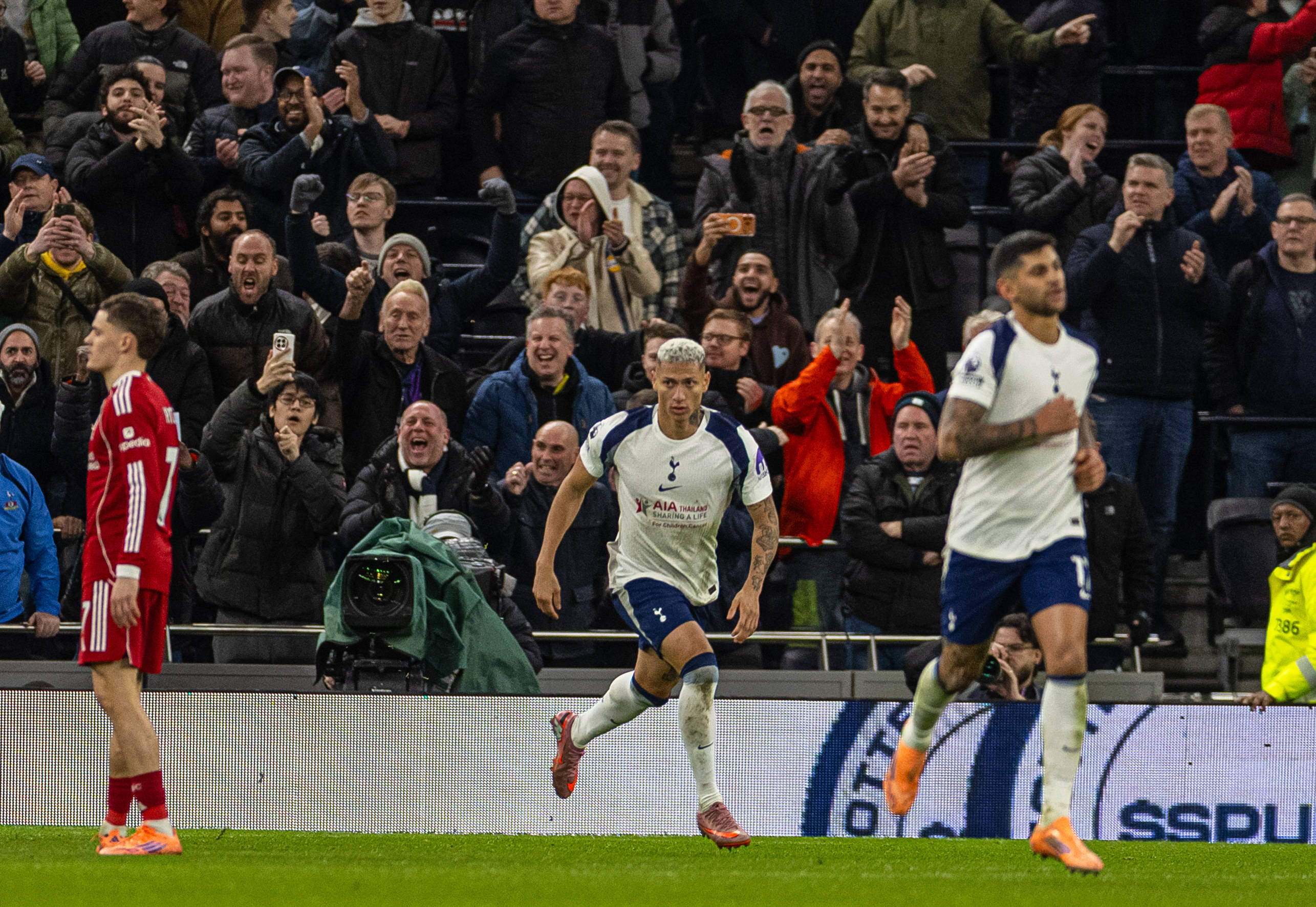 เมื่อวันที่ 20 ธันวาคม ริชาร์ลิซอน (กลาง) นักเตะของท็อตแน่ม ฮ็อตสเปอร์ ฉลองการทำประตูได้ สำนักข่าวซินหัว