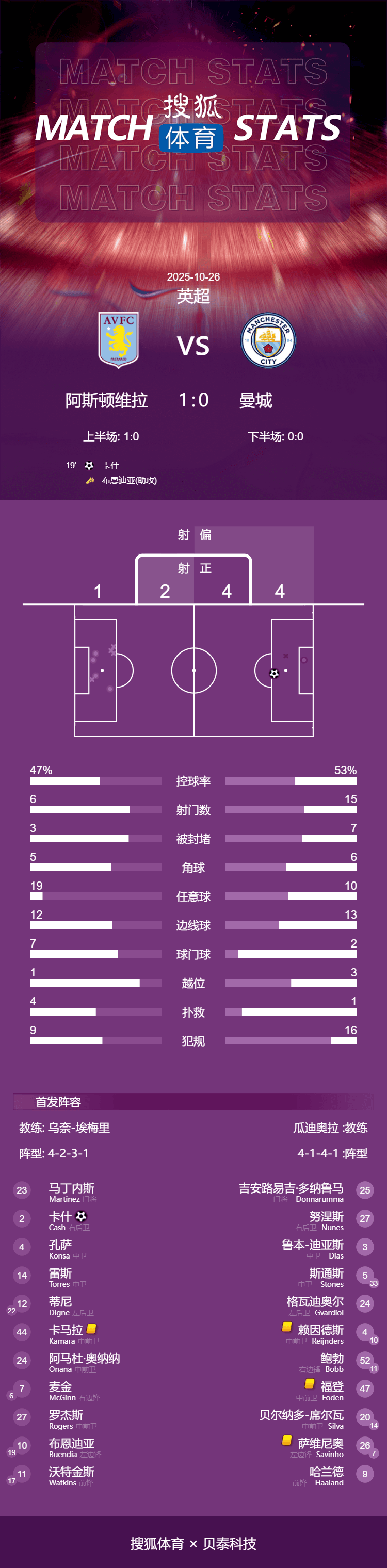 พรีเมียร์ลีก - ฮาลันด์ถูกตัดสินไม่ให้ประตู, แคชทำประตู แมนเชสเตอร์ ซิตี้ แพ้ 0-1 ต่อ แอสตัน วิลล่า โฟเดน, มอร์มอยส์, บูเอนเดีย