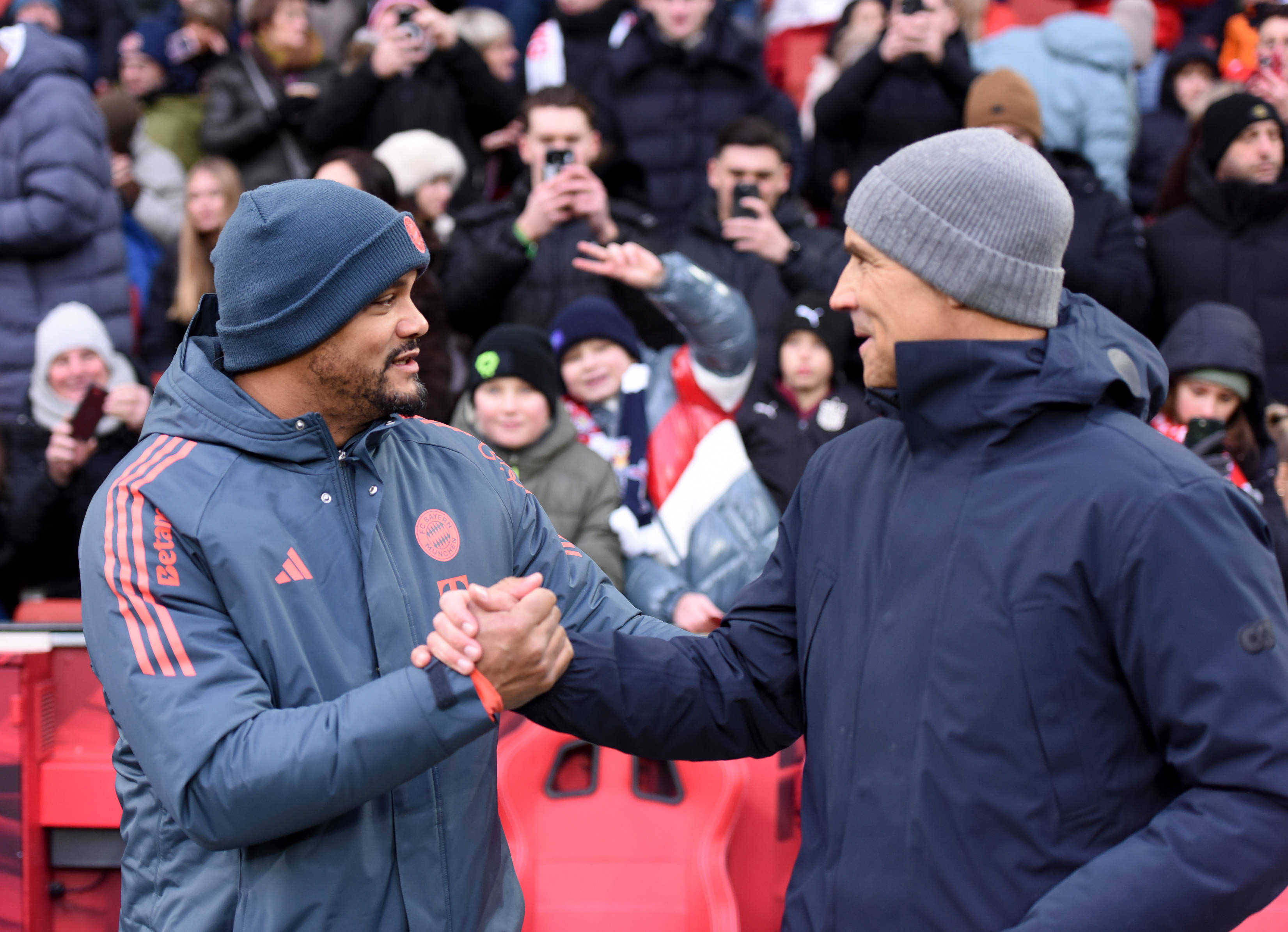 เมื่อวันที่ 6 มกราคม ผู้จัดการทีมบาเยิร์น มิวนิค วินเซนต์ คอมปานี (ซ้าย) และผู้จัดการทีมเรดบูลล์ ซัลซ์บวร์ก จูเลียน นาเกลส์มันน์ แลกการจับมือกันก่อนการแข่งขัน. ภาพโดย เฮ่ ฉานลิ่ง, สำนักข่าวซินหัว