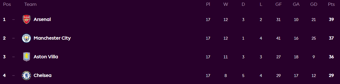 แม้จะตามหลังอาร์เซนอลในลีก แต่แมนเชสเตอร์ซิตี้ยังคงมีความสามารถในการแข่งขันสูงในทุกรายการแข่งขัน ในแชมเปี้ยนส์ลีก ทีมของกวาร์ดิโอลาอยู่ในอันดับที่สี่และมีโอกาสสูงที่จะจบในรอบก่อนรองชนะเลิศ ซึ่งจะทำให้พวกเขาได้ผ่านเข้ารอบ 16 ทีมสุดท้ายโดยอัตโนมัติ